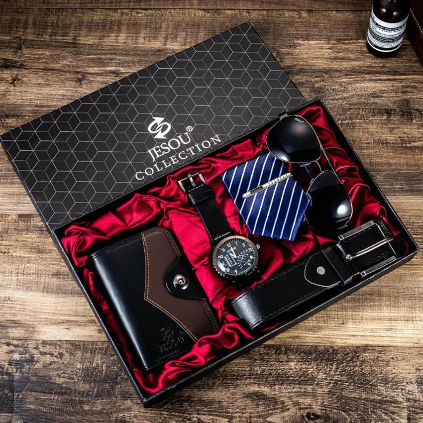 New Product Luxury Mens Watches Gift for Dad Quartz Wrist Watches Glasses belt wallet set Watches Men Husband B